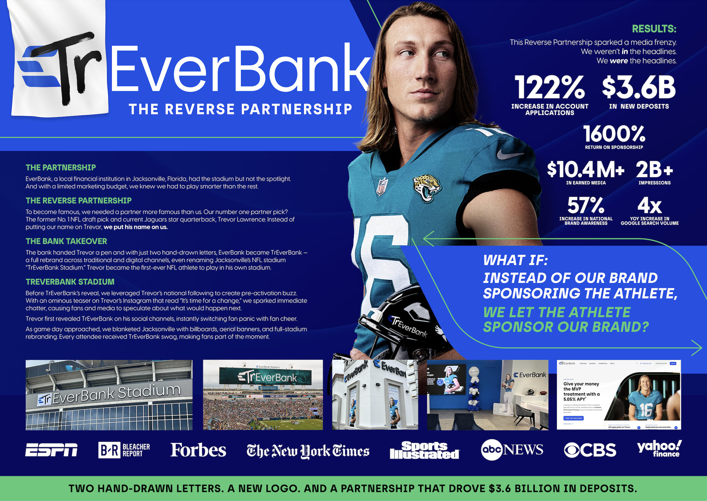 IDEA: To convince Trevor Lawrence to sign a partnership with EverBank, a local bank from Florida, we need to offer him much more than just money. So we gave Trevor the Bank and the opportunity to become the first NFL player to perform in his own stadium. It only took two letters, one cheap banner and 67,814 seats.